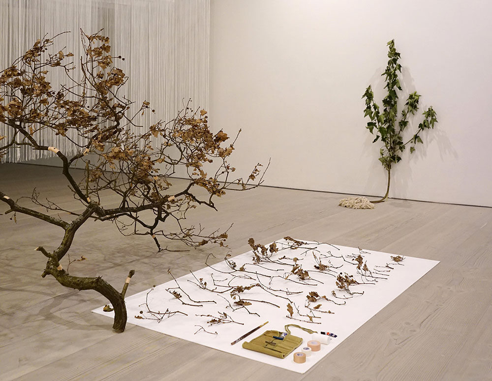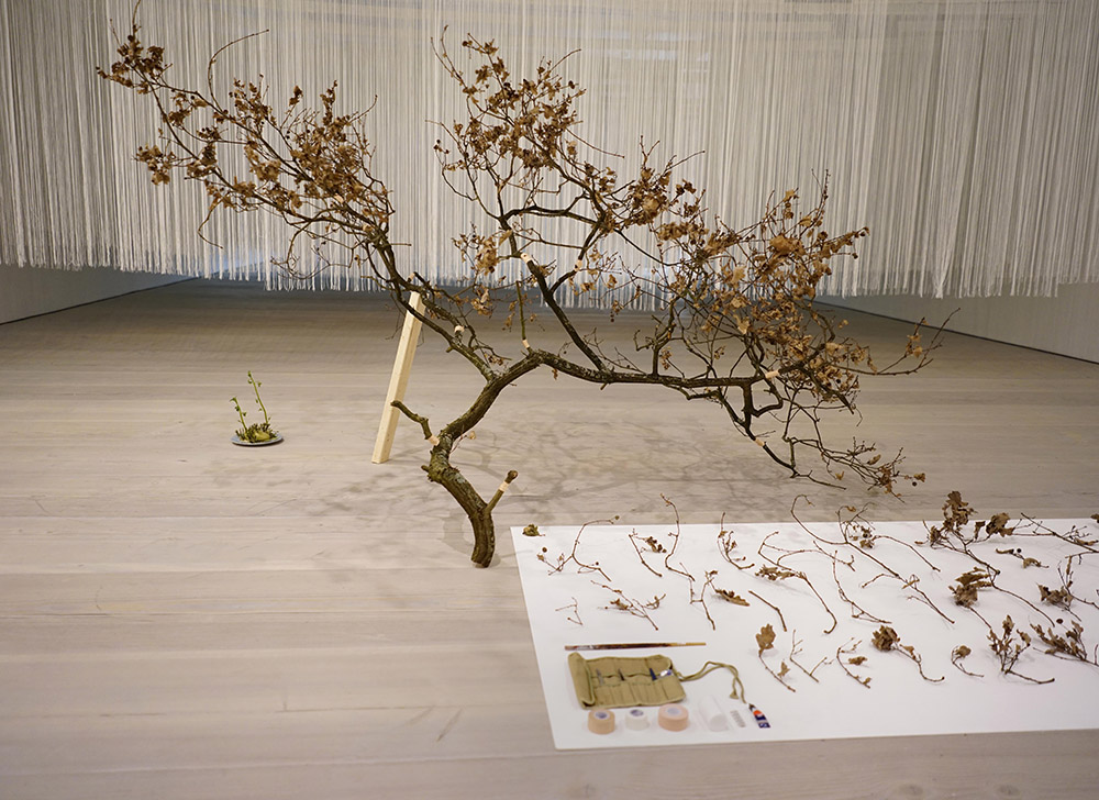 First Aid, is an English oak broken into over 80 pieces that has been glued and bandaged back together. Superglue and plasters, both designed to fix humans are used for the plant. This 2021 version adds the English oak (previously a lime), plus surgical kit and a number of branches which as of yet could not be repaired. These are laid out for ease of identification and re-uniting and look like a form of script, the plant communicating with us, (a nod to John Newling's Nymans Language). Unfortunately due to human error these limbs cannot currently be re-united with their original positions.
