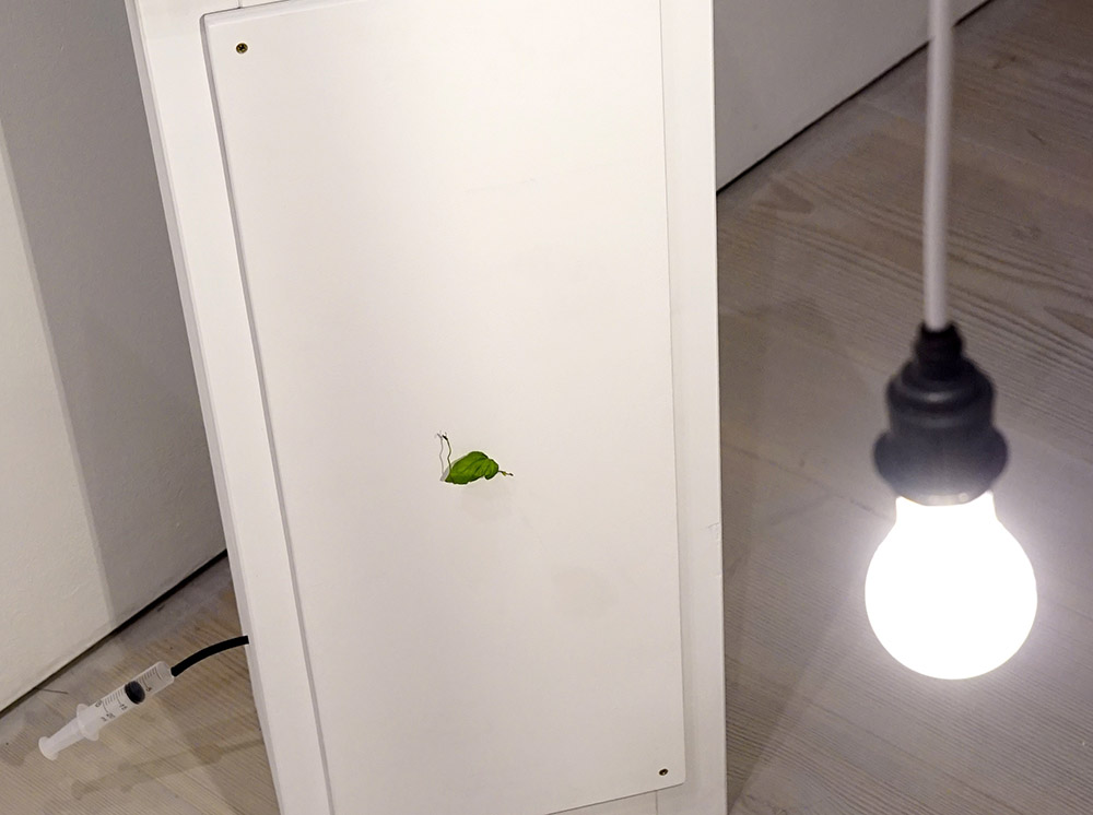 A bindweed locked in a specially constructed blackout cupboard with only one tiny hole and light source. It finds its way from the darkside. This is the WIP, (syringe for watering). The front panel is later removed to present plant pot on the black side of the panel and bindweed passing through to the light.