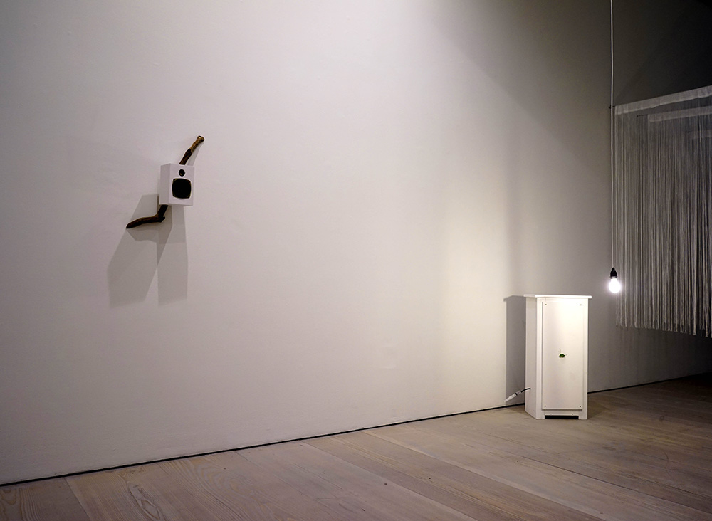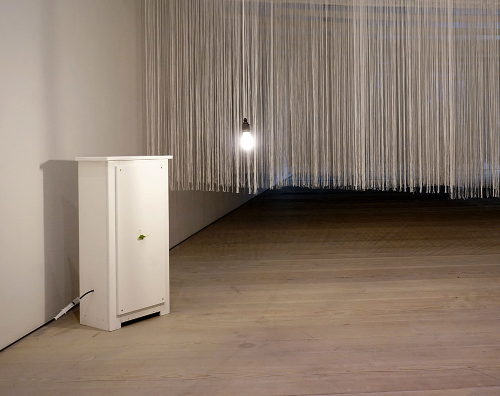 Gallery 4 is divided by a maze of string curtains. The entrance presents ideas upon the entangled lives of living things, human control and symbiotic relationships. Bird sound and flickering image emanate through the strings, to find an emancipatory experience with the film Our House.