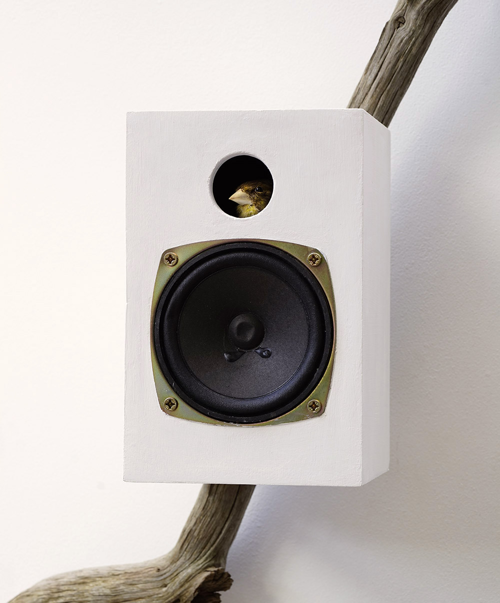 Tweeter, 2021. Wood, electronics, taxidermy.