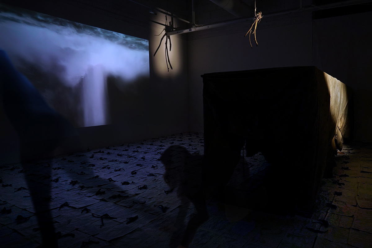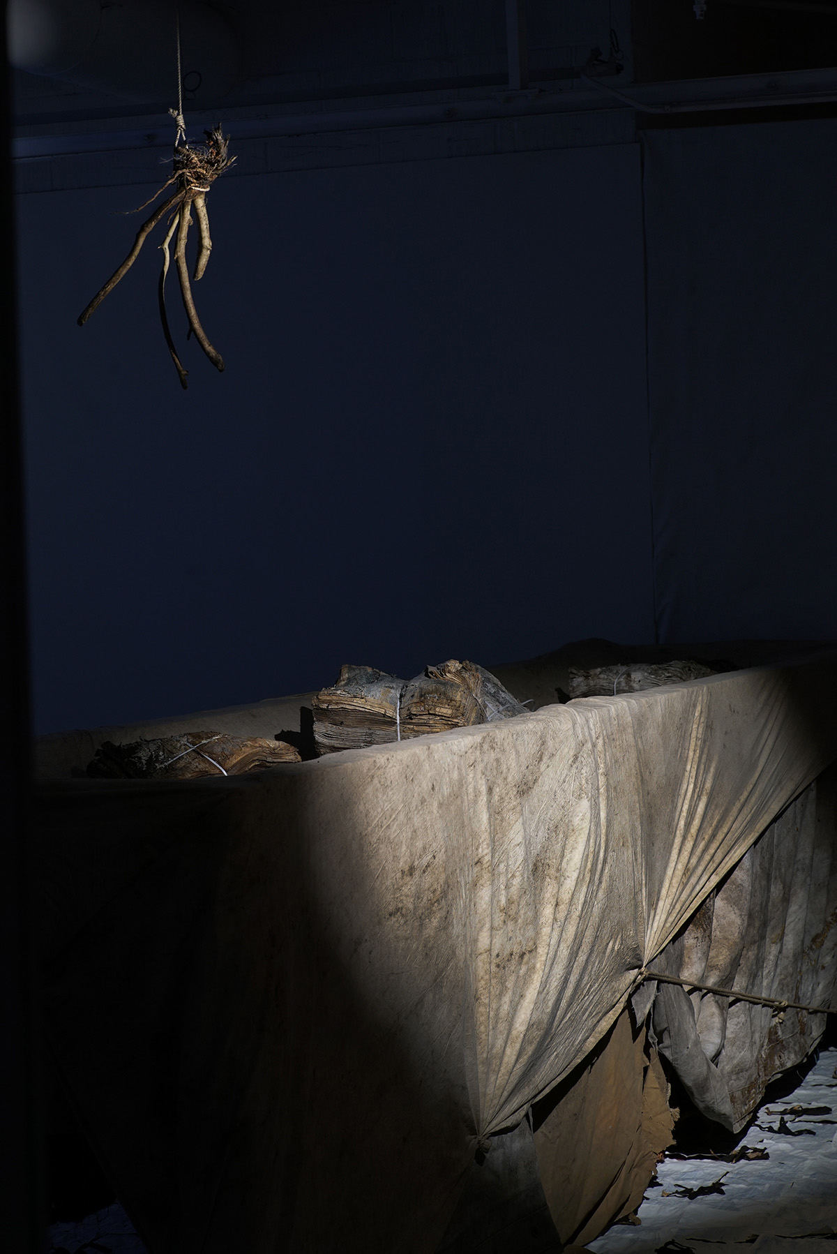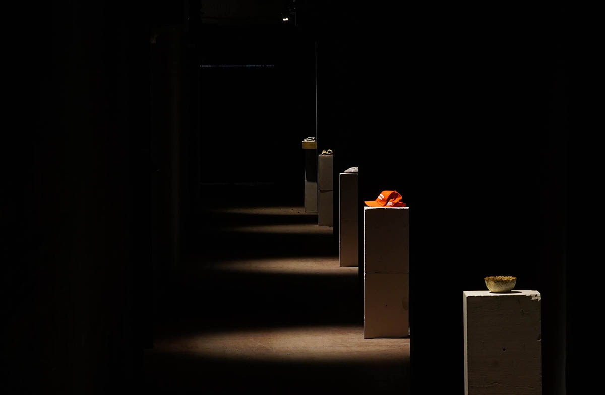 The work expresses inseparable links between ecocide and genocide, forcing the public on hands and knees through what they think is a tunnel whilst being pressured by rotten media, to then, unbeknownst to them, trample over a monoculture of sculptural sentient dried banana skins and 32,000 names face down and partially washed, people who have died in recent attacks.