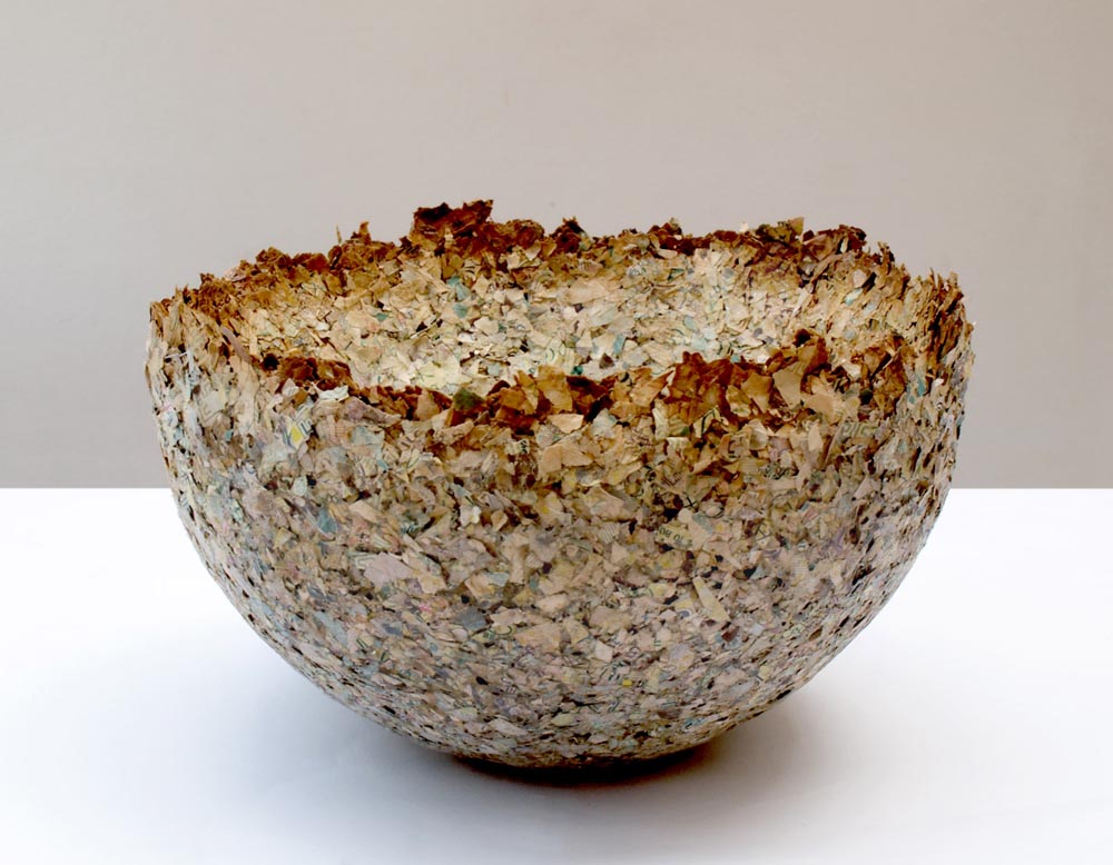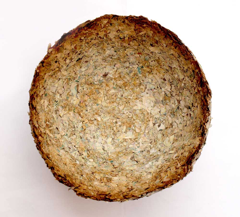 This work entitled 'Priceless' has been made from £1000.00 of recycled sterling; shredded five pound notes fit for landfill or loft insulation. Banknotes were mixed with flour and water, then worked and oven-baked to form a simple paupers bowl. This artwork is part bowl, part bread.