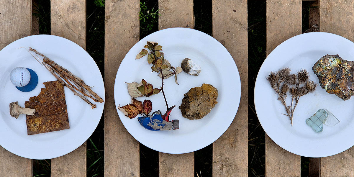 Three associated artworks. Exposed artefacts from the land, separated from the work and presented as dishes adjacent to Table. These morsels from the landscape whet the appetite for discussion and workshops to secondary school children regarding ecosystems and circular economy.
