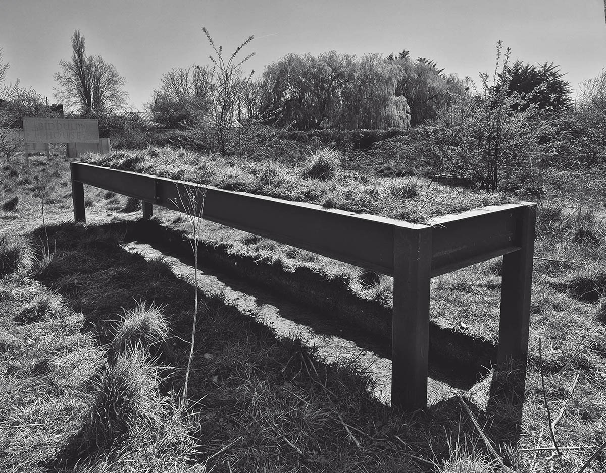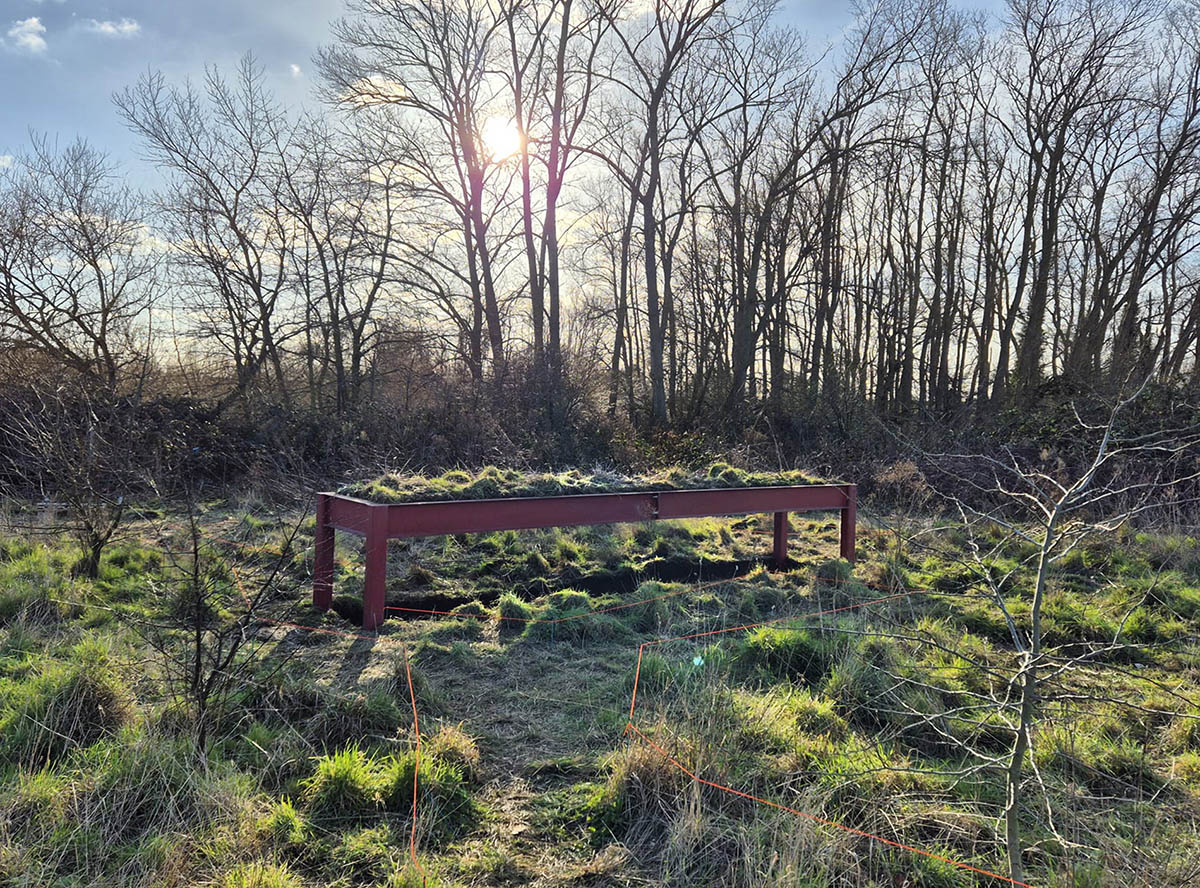 Table - What's On Your Plate, is a sculpture that refers to history, the present and the future and so speaks of the power of change. It presents a table in a wild meadow where the meadow itself is brought to table level. Meadow turf below the table to a depth of 30cm is carefully cut and removed without damage, then installed directly above where it came from, onto the top of the table leaving a hole in the earth beneath. The central table is framed by the surrounding wild meadow of native species. Its framing changes throughout the year as species in the meadow change and interact. The work, playing interchangably with 'garden' & 'table' utilises one of our most biodiverse habitats, of which we have only 3% remaining in Britain and is known to store more carbon than heath and shrubland.