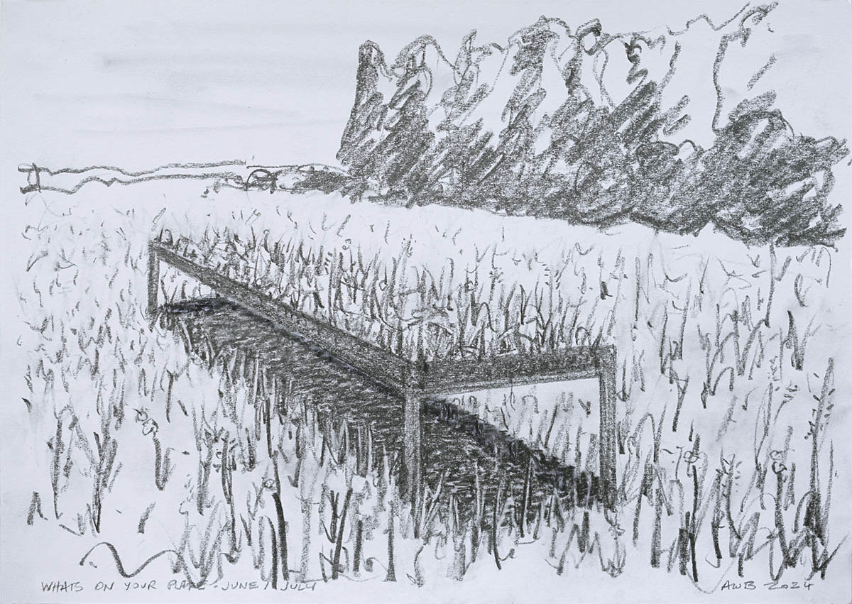 Preliminary graphite study in springtime. British meadow flora, co-habiting species, soil, steel.