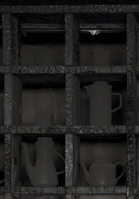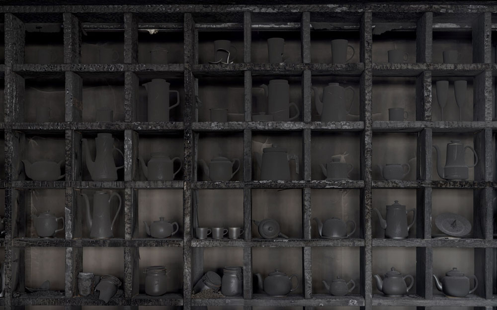 Medium: wood, porcelain, ash, tea, cake