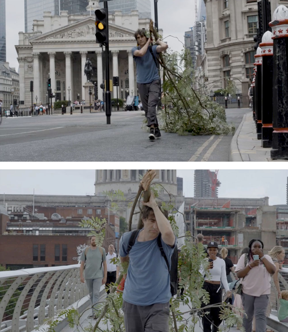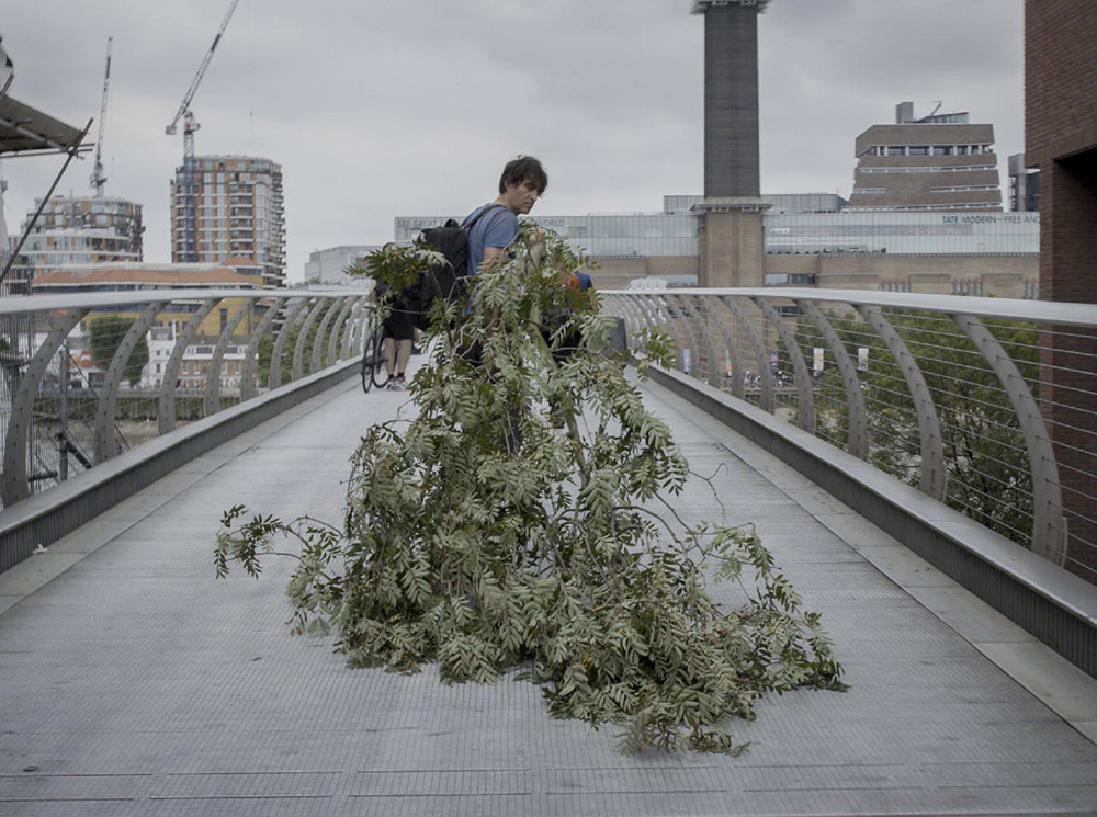 A near living tree was dragged into Central London via the financial district, to Tate Modern where both tree and performer expired. Tree was mounted with electronics to amplify the friction with its environment.