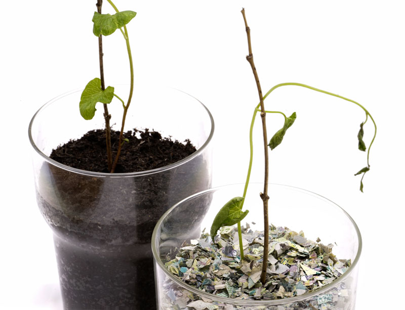 Both pots are planted with the same plants, the fast growing and persistent field bindweed, Convolvulus arvensis. The left hand growing medium is London soil mixed with compost, whilst the right hand pot is filled with shredded £5 notes. Both pots were watered equally.