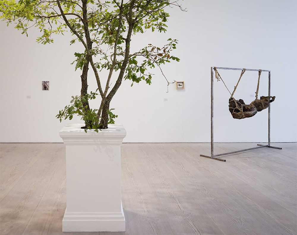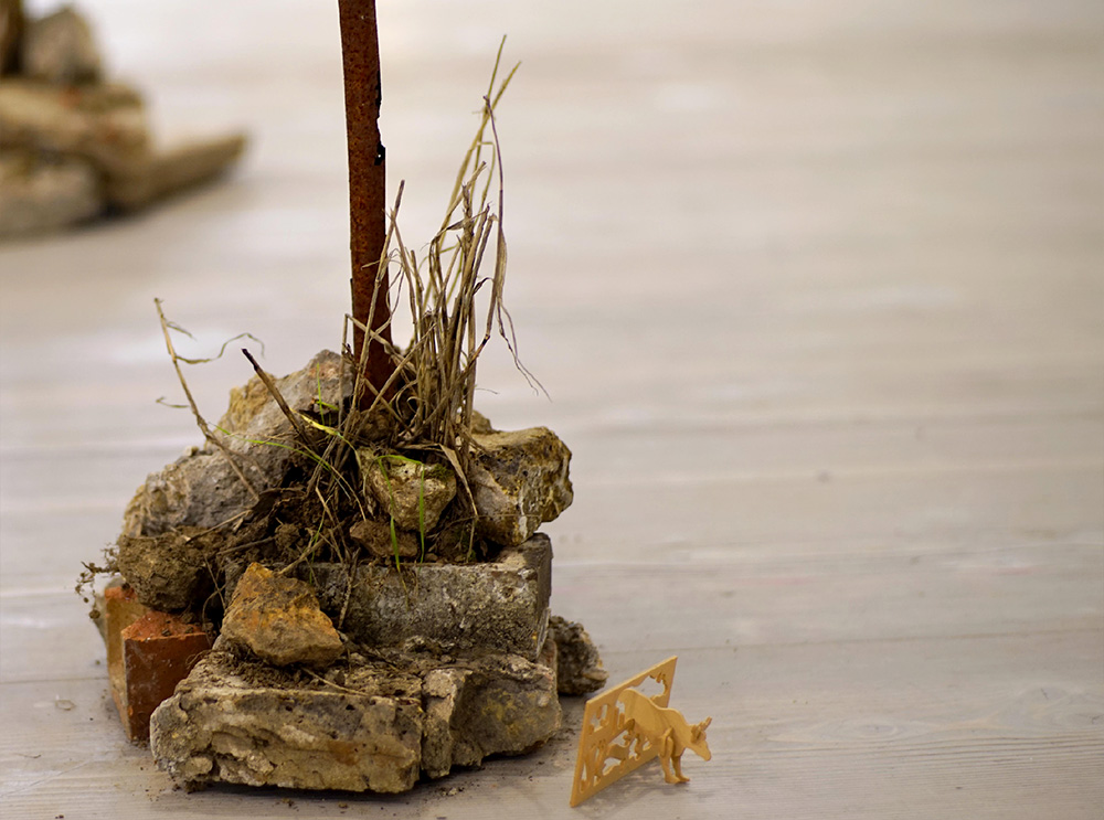 On entering Gallery 1 you are met by ancient branches from each native UK tree species, seemingly growing out of concrete rubble. At the base of one is a book entitled Plants in the Service of Man. All constituents of the world are represented here. The raw materials that made society, together with organic limbs that support our ecosystem. Many branches have a dipped head or flower, an antique watering can rose. Some stems are cut and show bright red flesh or silver metallic core within the bark. Four stems are not branches but pipes, one placard and crutch. They all lean towards the door, towards the light.